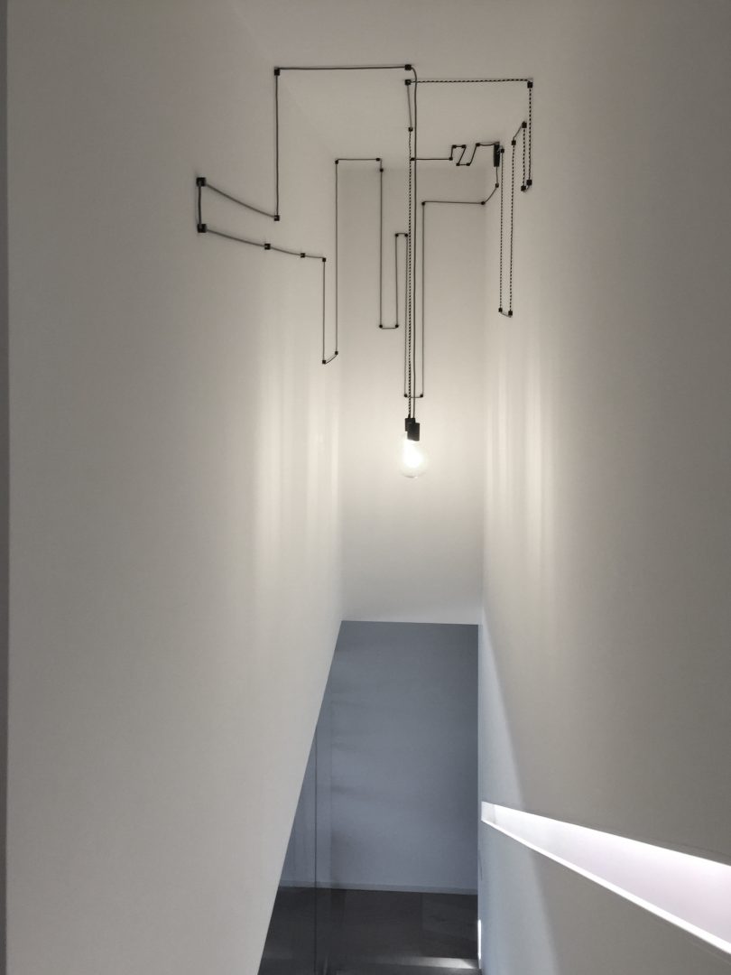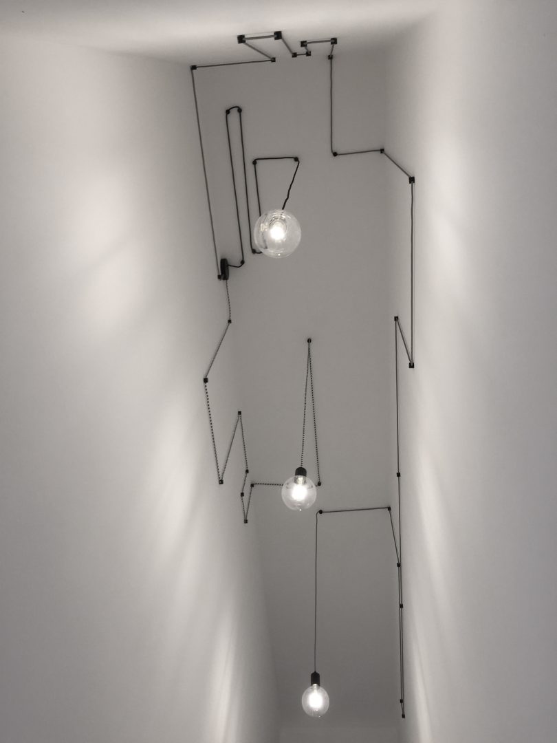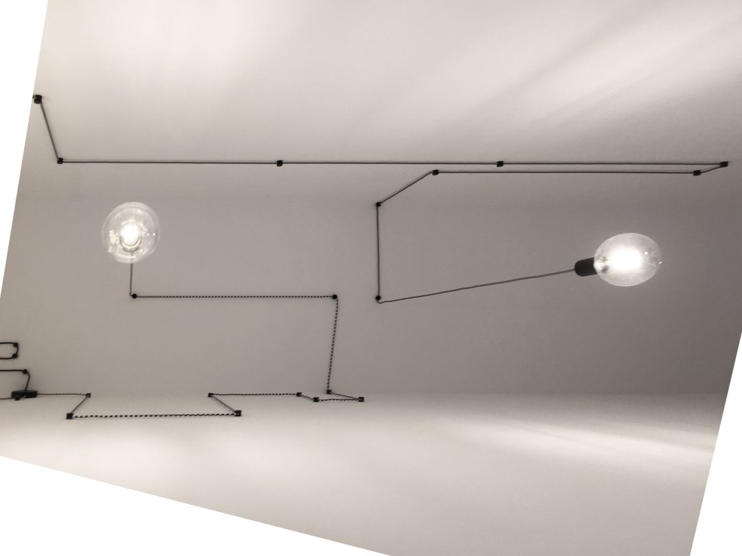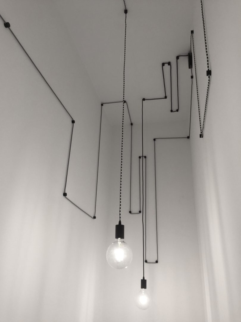 3 cavi bianco/neri con texture differenti escono da un rosone a parete e si rincorrono creando un gioco di linee che ricorda quello di un circuito stampato.